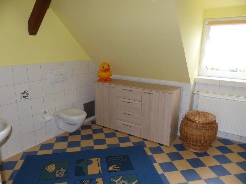 - Das Bad mit Dusche, Wanne, Waschbecken und WC